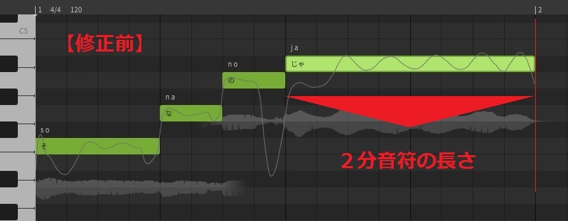 上図の例では、「♪そ~・な・の・じゃ~」の「じゃ~」の音を3拍目から2分音符の長さで入力しました。